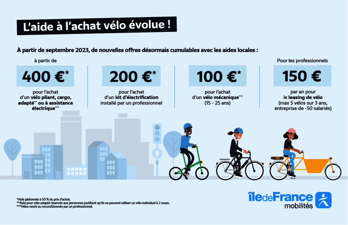 Plus d’informations sur : www.iledefrance-mobilites.fr/le-reseau/services-de-mobilite/velo/prime-achat-velo