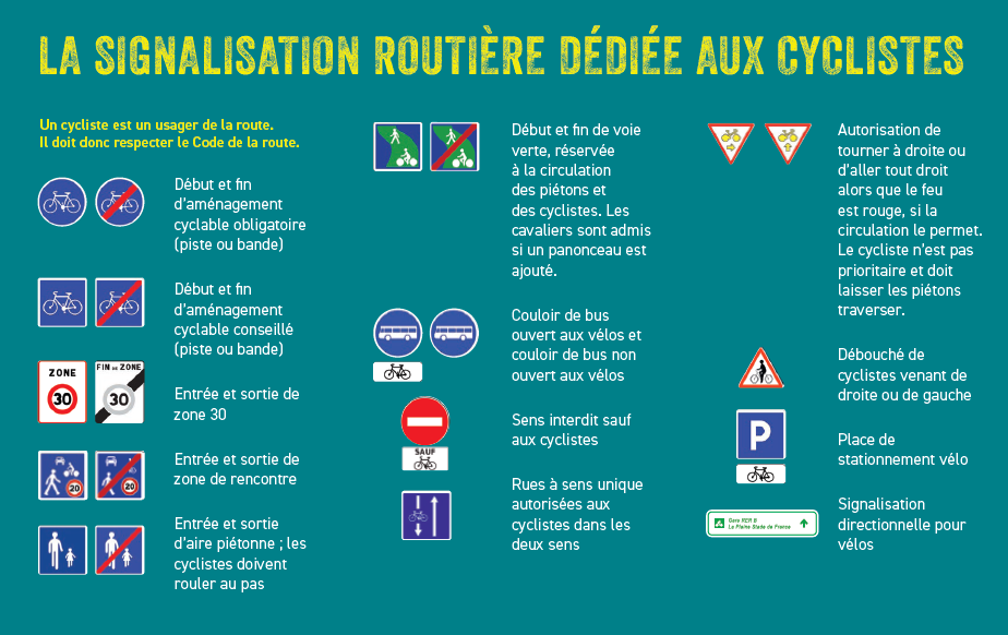 - Zone 30 : section ou ensemble de rues où la vitesse est limitée à 30 km/h pour l’ensemble des usagers y circulant (cyclistes, véhicules motorisés, deux-roues, transports en commun, etc.) afin de garantir une meilleure sécurité pour les cyclistes.