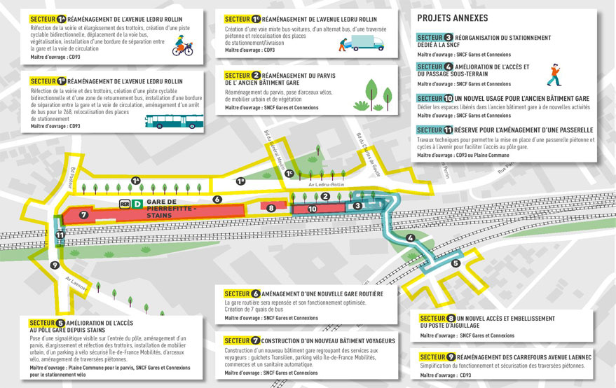 Le pôle gare Pierrefitte-Stains (RER D, tramway T11 et 4 lignes de bus) va être réaménagé afin de répondre aux nouveaux besoins de ses usagers engendrés par l’arrivée du T11 en 2017 mais aussi pour améliorer le fonctionnement de la gare routière, faciliter l’accès au pôle gare et encourager le développement des mobilités actives. Les travaux menés par Plaine Commune, le Département de la Seine-Saint-Denis et SNCF Gares & Connexions devraient débuter en 2023 et s’achever en 2025.