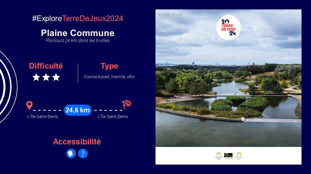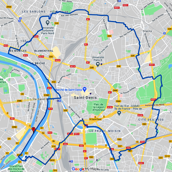 Vous prendrez le départ au niveau de l’écoquartier fluvial de L’Ile-Saint-Denis qui accueillera une partie du Village des Athlètes, pour arriver à l’église de Saint-Denis. Le tracé du parcours passe ensuite  au cœur du quartier Pleyel qui accueillera bientôt l’une des gares du Grand Paris Express et qui a également été choisi pour recevoir le Village des athlètes en 2024. Vous longerez ensuite le canal de Saint-Denis pour arriver devant le Stade de France, l’un des principaux sites de la compétition puisque s’y dérouleront les compétitions d’athlétisme et de rugby à 7. Cet itinéraire, réservé à des coureurs disposant d’une très bonne condition physique, vous fera ensuite traverser Aubervilliers pour arriver au parc Georges Valbon de La Courneuve, où prendra place l’un des centres d’entraînement pour les équipes nationales d’athlétisme en 2024. Votre tour du territoire passera ensuite par Stains et sa cité-jardins jusqu’à la Butte-Pinson, écrin de verdure sur les hauteurs boisées de Villetaneuse. En fin de parcours, vous pourrez observer l’université Sorbonne Paris Nord avant de finir le parcours en longeant les berges de Seine jusqu’à revenir sur l’Île-Saint-Denis.