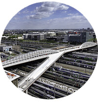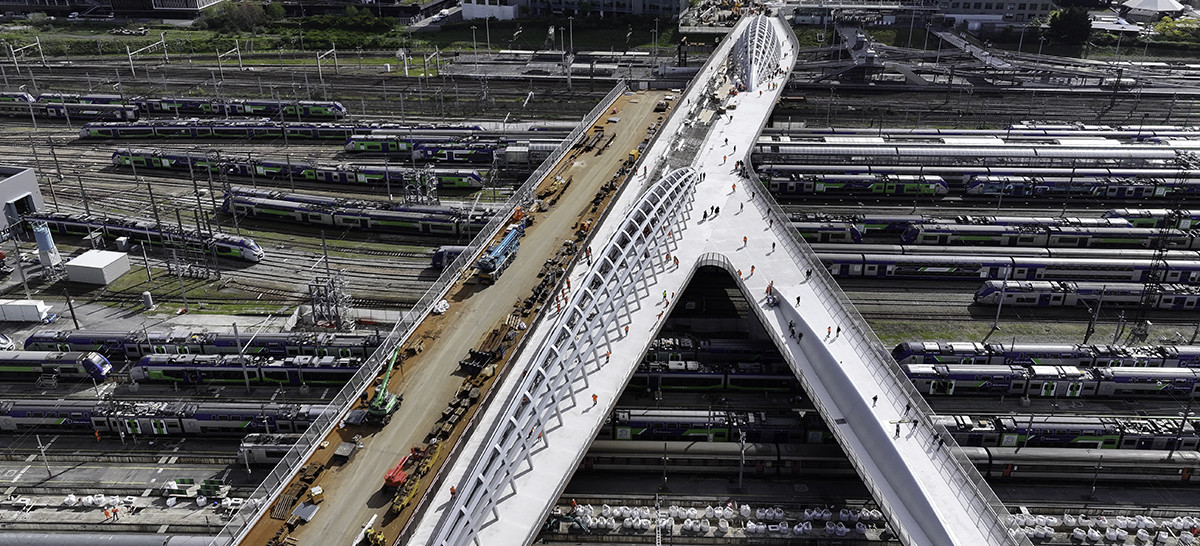 Avec une longueur de 300 m, l’ouvrage monumental permet de traverser l’un des faisceaux ferroviaires les plus circulés au monde, après ceux de Chicago et Tokyo :