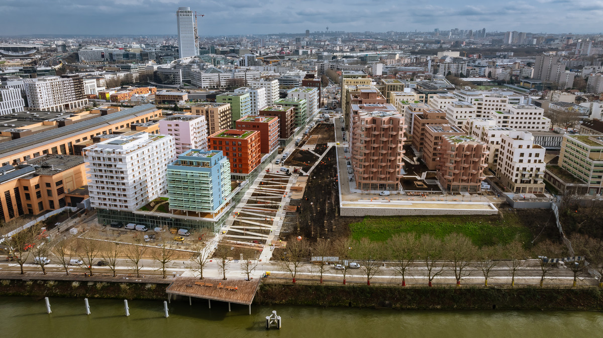Le Village des athlètes photographié en février 2024. La partie dionysienne du village, située en bord de seine et partie intégrante du projet Pleyel, accueillera après les Jeux plus de 1000 nouveaux logements, mais aussi des bureaux, commerces, équipements publics et espaces verts.