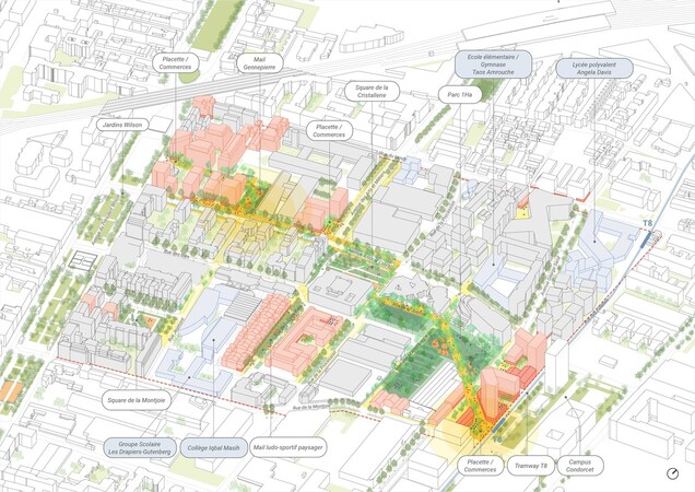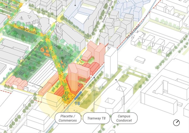Ce secteur en pleine mutation est appelé à devenir un pôle majeur d’attractivité. Il bénéficiera par ailleurs du prolongement de la ligne T8 le long de la rue des Fillettes, dont la mise en service prévue à l’horizon 2030/2031 assurera une liaison directe avec Paris (station Rosa Parks 19e arrondissement) au sud et le centre-ville de Saint-Denis au nord.